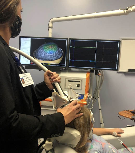 Transcranial magnetic stimulation (TMS) showing the area of brain that controls a child's thumb movement.