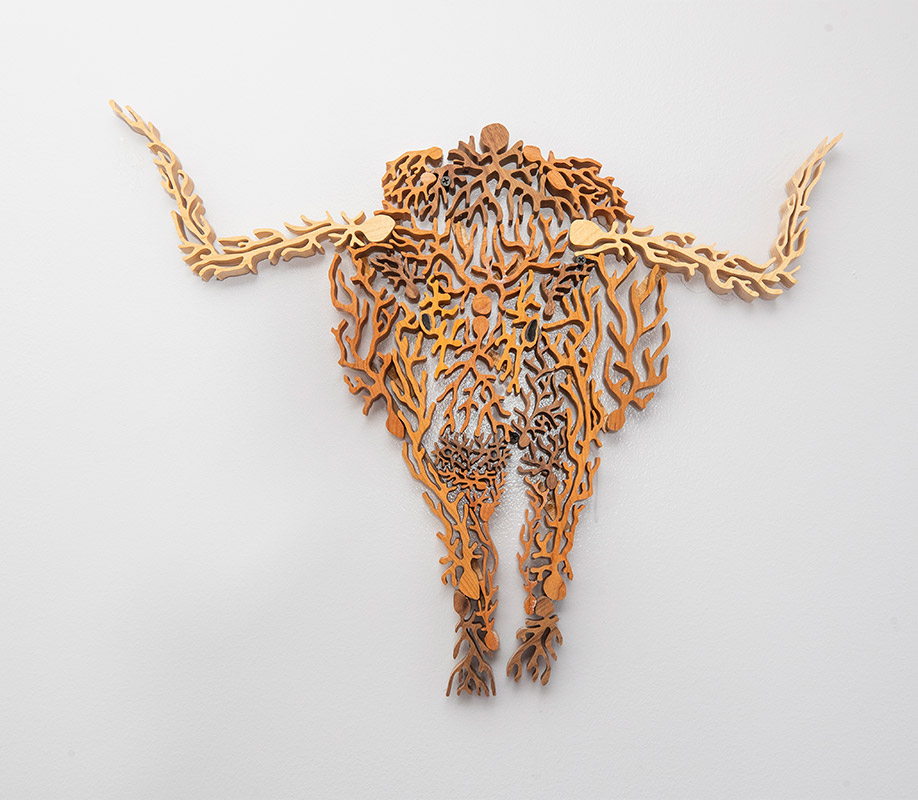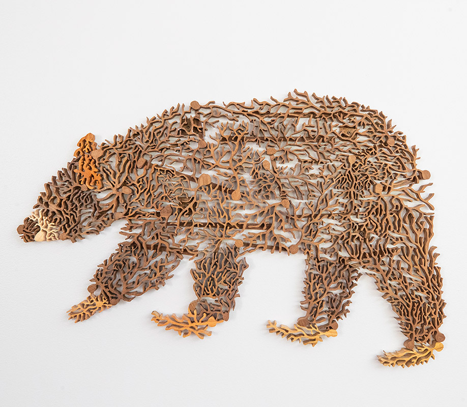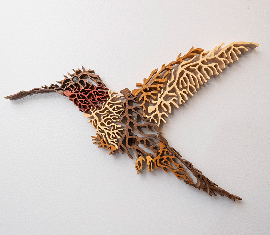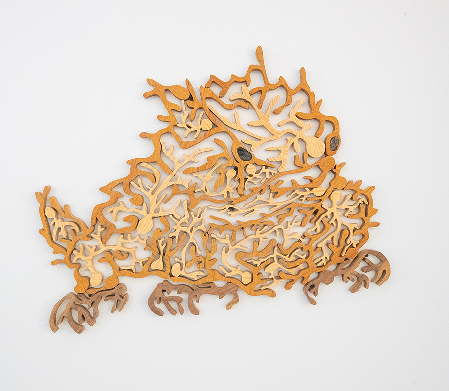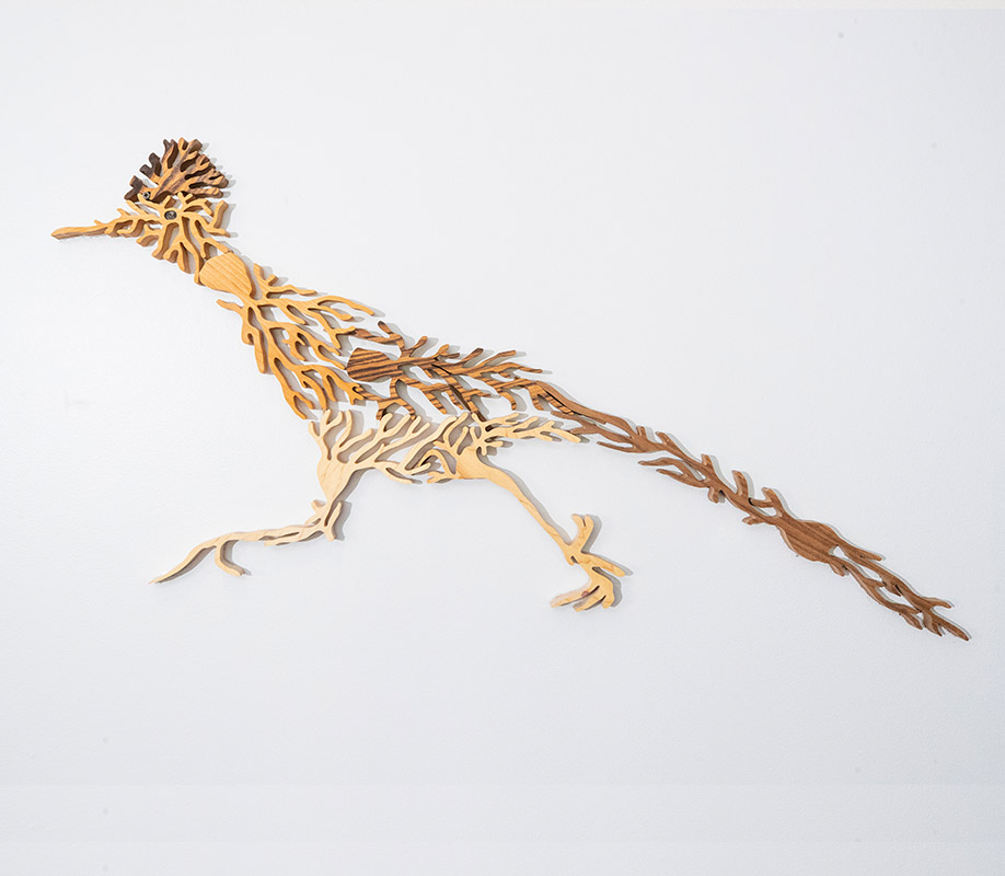 Like Einstein imagined himself riding a particle of light, I often find myself in a trance, imagining I am inside the nervous system, witnessing the way brain cells accomplish their jobs. Trillions of these cells tirelessly work in our brain tissue to create our thoughts and personalities. What a lot of people may not know is that these cells are simply beautiful. Many of them resemble other structures found in nature, and in particular trees and other plants. For that reason, it only made sense to try to transpose the shape of brain cells to wood. Using a variety of woodworking tools, I sculpt wood to create artistic representations of these cells based on scientific knowledge. My work tries to remind people that we are biological machines full of microscopic wonders. The idea to create animals with neurons made of wood came from Jill Koss, director of Family Support Services at Cook Children’s, who is the master planner in charge of organizing the space for the Neuroart collection.