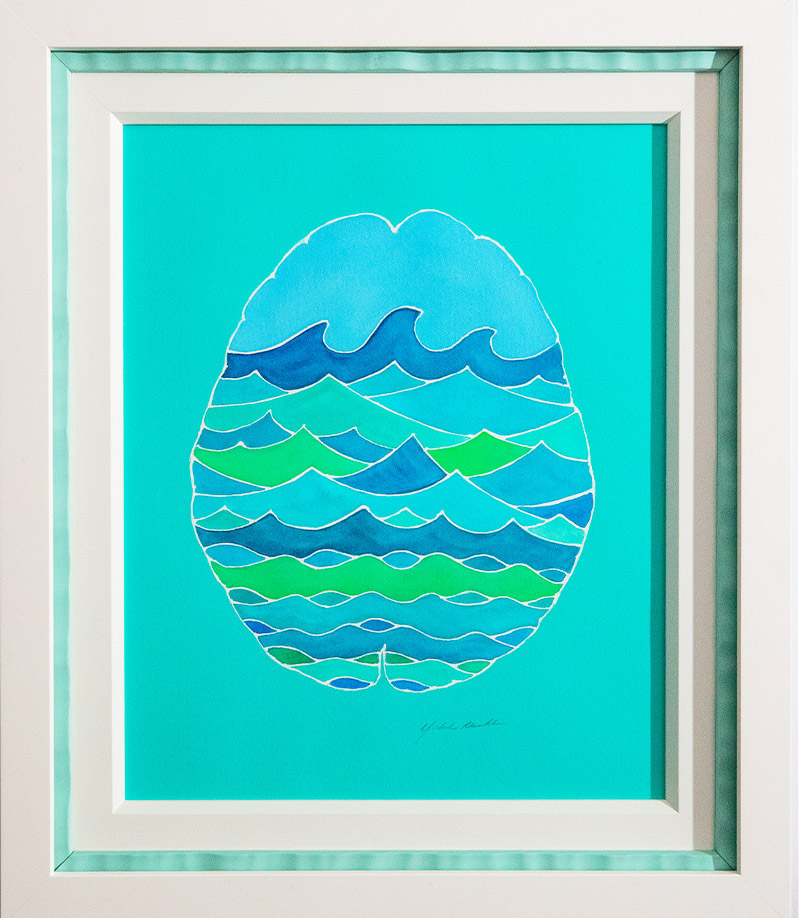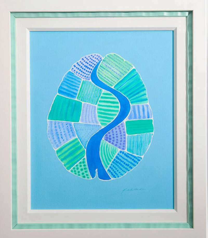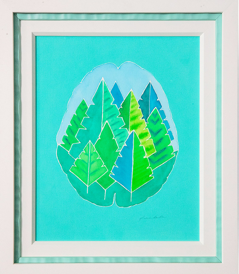 I did the 'Nature Brains' in watercolor on paper. I used a resist to create the images inside the brains. After painting and removing the resist, this technique leaves white lines, which give a feeling of lightness to the images.