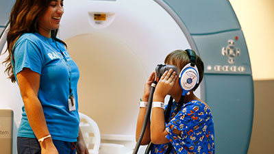 The MRI machine is designed like a tunnel and, like a tunnel, is open at both ends. Your child will lie down on a table that slides into the tunnel. During the scan the tunnel remains still while the magnets inside the machine spin around to capture images. The MRI makes a very loud sound due to the power of the magnets inside. Earplugs or headphones for music will be provided to reduce the noise.